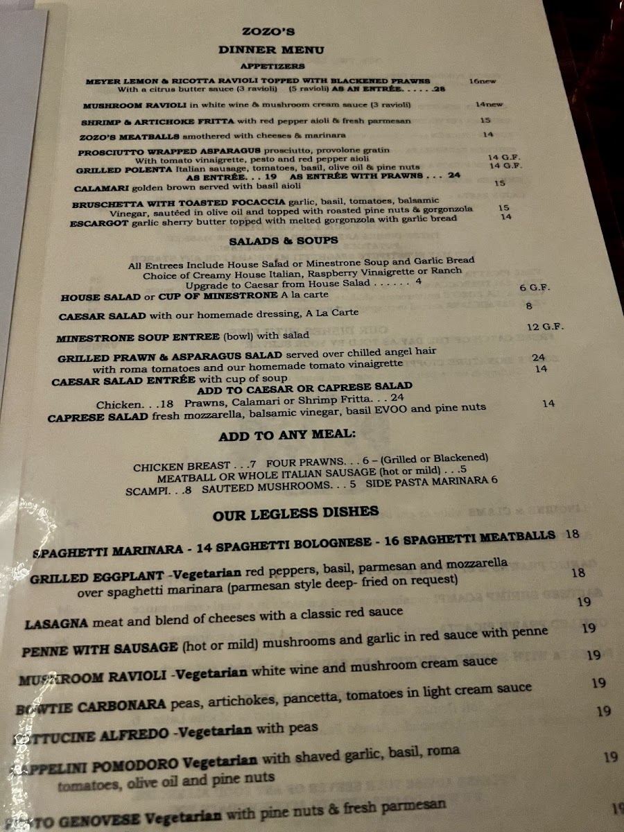 At Zozo's, the menu is a love letter to Italian cuisine, showcasing a range of dishes bursting with flavor and quality ingredients. Start your culinary journey with the Minestrone Soup, a hearty warm hug in a bowl, or the Bruschetta with toasted focaccia, featuring a medley of garlic, fresh basil, ripe tomatoes, and a drizzle of balsamic vinegar – each bite a heavenly explosion of flavor. If you're looking for something hearty, the Mushroom Ravioli is highly recommended: delicate pasta filled with earthiness, sautéed in a rich white wine and mushroom cream sauce that will linger on your palate. For an unforgettable twist, don't miss the Lobster Ravioli, where perfectly cooked pasta meets succulent lobster and tarragon cream sauce, promising a taste sensation that will transport you straight to the Amalfi Coast.